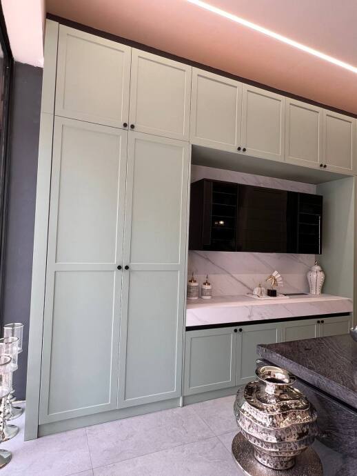 کابینت روکش وکیوم رنگ سبز پسته ای اجرا شده داخل شوروم مجموعه.