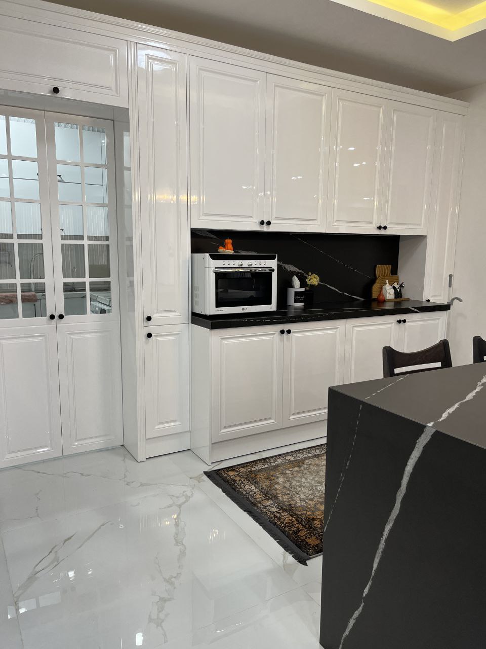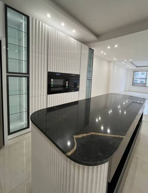 قرار دادن ویترین در اول و اخر کابینت استفاده از فر و هواپز توکار و کابینت های کمدی برای فضای بیشتر . اجرای آیلند منحنی با طرح مدادی و استفاده از سنگ طبیعی مشکی با رگه های طلایی.