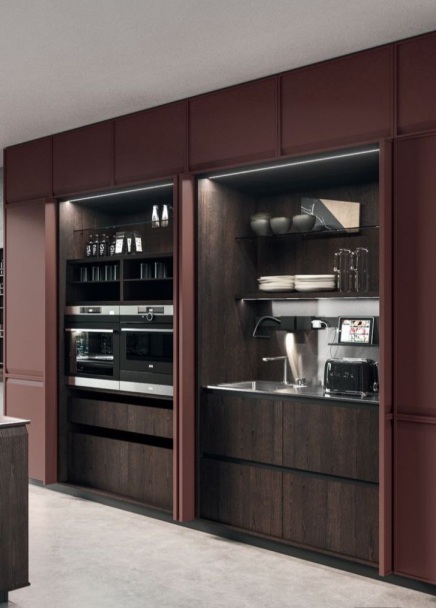 کابینت مدرن با تلفیق رنگ های سفید و طرح چوب روشن و استفاده از کابینت های کمدی برای فضای بیشتر قرار دادن فر و قهوه ساز توکار